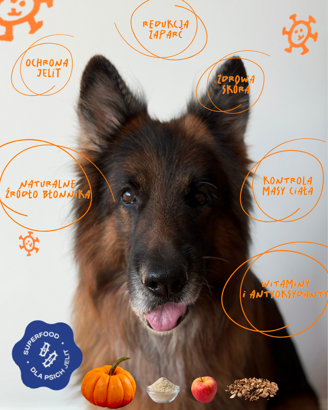 To codzienne wsparcie jelit psa żyjącego w środowisku pełnym bodźców, smogu i miejskiego tempa.
